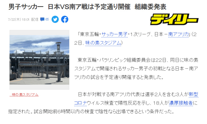 来源:JRS直播网07-22 19:39JRS直播网讯 北京时间7月22日,东京奥组委官方宣布,南非男足与日本男足的比赛,将会如期进行。此前4天,南非有2名球员检测呈阳性,一共21人遭到隔离。按照计划,这场比赛将在当地时间22日晚8点进行!毫无疑问,日本男足参加这场比赛,冒着巨大的风险。