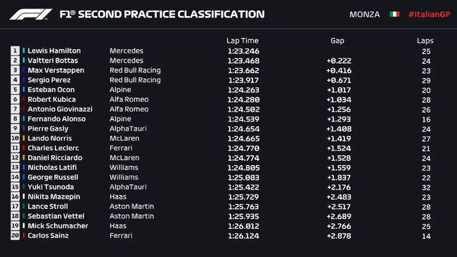 JRS直播网讯 北京时间9月11日晚,2021F1意大利大奖赛第二次自由练习赛在蒙扎赛道正式落下帷幕。二练中,汉密尔顿、博塔斯分列一二,维斯塔潘第三。