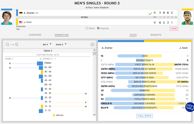 第四盘,前两局双方各自保发后,第3局,A-兹维列夫挽救2个局点、又浪费1个破发点后,率先破发。此后,索克退赛,德国人直接晋级第四轮。