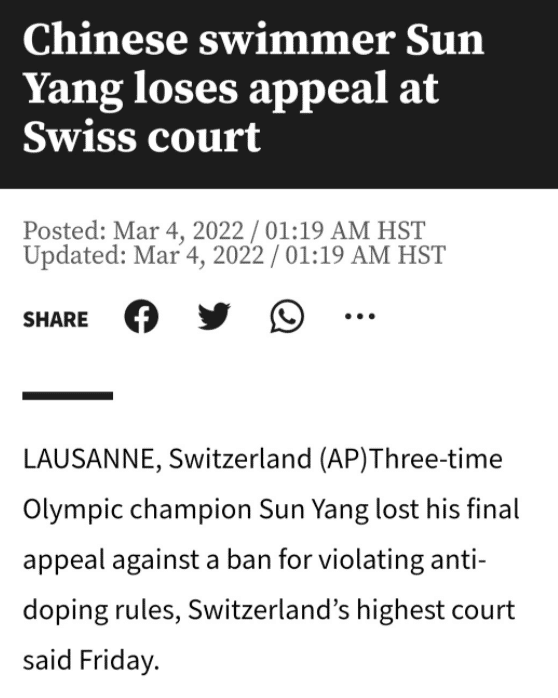 其实这个结果其实可以被预判,瑞士联邦最高法院第一次推翻CAS的裁决,已经令人比较意外。而对于此次的上诉,孙杨还需要支付15000瑞士法郎,也就是10.3万人民币左右的费用。不过,对于孙杨来说,这并不算什么。
