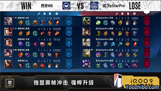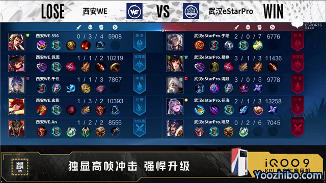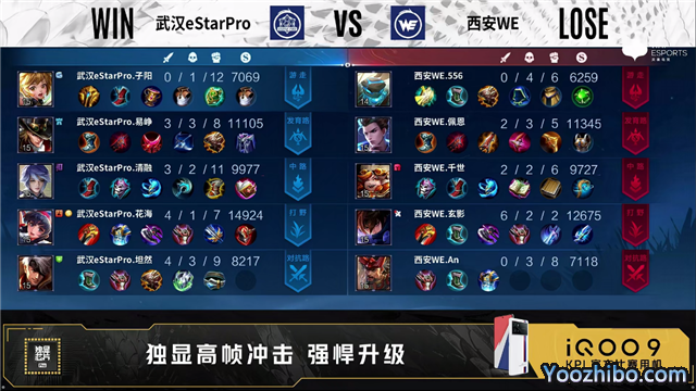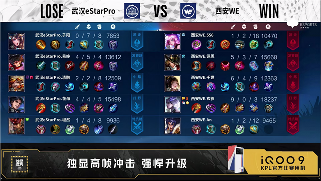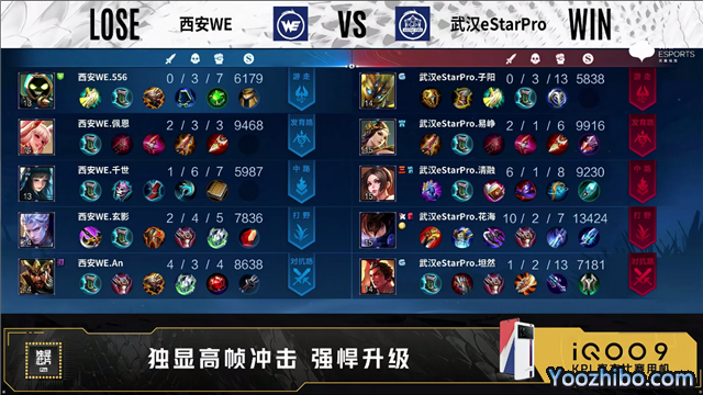 第一局开局武汉eStar中路、对抗路换线。1分04秒武汉eStar中路击杀西施拿下一血。1分15秒武汉eStar野区击杀铠。1分38秒武汉eStar对抗路击杀关羽。3分19秒野区团西安WE打出2换4。4分36秒武汉eStar拿下暴君。5分03秒武汉eStar摧毁敌方发育路外塔。5分18秒武汉eStar对抗路击杀关羽。5分44秒武汉eStar摧毁敌方对抗路外塔。6分10秒野区团武汉eStar打出1换3,随后摧毁敌方发育路二塔。7分28秒武汉eStar野区击杀西施。8分06秒武汉eStar摧毁敌方对抗路二塔。8分45秒双方中路1换1。9分37秒武汉eStar拿下暴君。10分13秒武汉eStar拿下暗影主宰。10分46秒西安WE中路击杀吕布。11分钟中路团武汉eStar打出1换2。11分56秒武汉eStar拿下暗影暴君。12分37秒发育路团武汉eStar0换5团灭对手,不知火舞拿下三连决胜。14分03秒武汉eStar摧毁水晶拿下比赛。