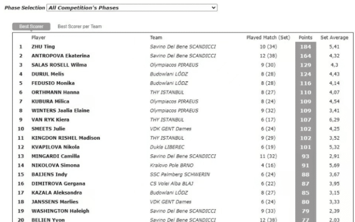 即便是放在整个欧联杯赛季,朱婷缺席两场比赛,数据如下:扣球313扣162中10被拦7失误,成功率51.8%,效率46%,一传220个,到位率67%。总得分第一、成功率第七、效率第三、所有边攻球员中高居第一,数据傲人,就是这样的情况下,朱婷却无缘欧联杯MVP的荣誉。