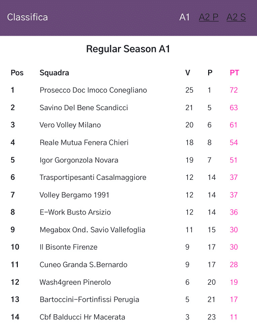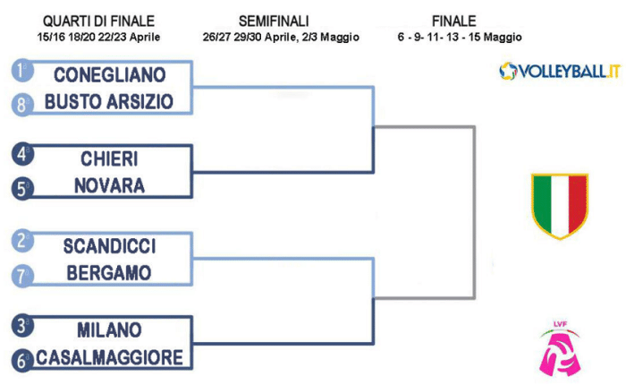 按照规则,常规赛排名前八的球队晋级到季后赛,季后赛1/4决赛和半决赛三场两胜,决赛五场三胜。科内利亚诺一骑绝尘,取得了25胜1负的战绩,再度拿下常规赛冠军,唯一输球的场次是0-3不敌斯坎迪奇,她们季后赛对阵第八的布斯托阿西齐奥。斯坎迪奇战绩为21胜5负,积63分,获得第二名,季后赛大战12胜14负的贝加莫。