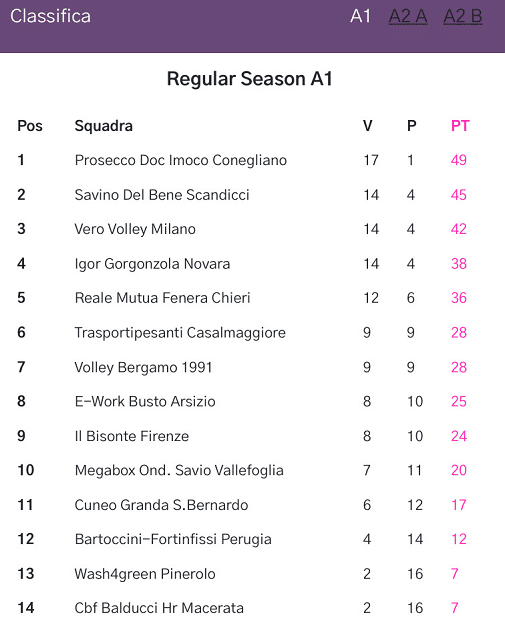 来源:JRS直播网02-16 21:16JRS直播网讯02月16日意甲第18轮已经正式落下帷幕,意大利女排联赛一共有26轮,如今仅剩8轮,各队的竞争还是很激烈的,有力争常规赛冠军,也有卡位需求的队伍,还有的球队力争保级。目前科内利亚诺以17胜1负排名第一,朱婷和姚迪所在的斯坎迪奇位居第二,缪伊雯新东家皮内罗洛处于降级区,排名倒数第二。按照意甲的规则,1-8名参加季后赛,倒数两名球队降级到意乙联赛。