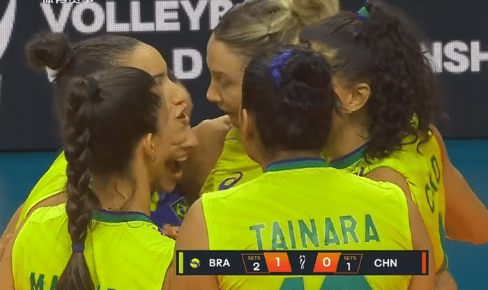 第二局的比赛,中国女排的一传,拦网全部出现了问题,巴西女排轰出了12:5的梦话开局,场上越打越乱,袁心玥探头触网,丁霞、杨涵玉接连上场,李盈莹轻吊得分,袁心玥快球得分,卡罗尔连续扣球得分,25:17,巴西女排扳回一局,大比分来到1:1平。
