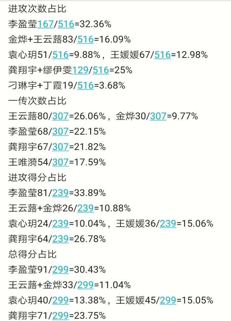 再加上李盈莹接一传次数占比22.15%,高居队内第2,仅次于王云璐,这点和朱婷是非常像的,里约奥运会期间,朱婷也是进攻第一,接一传第二。所以说现在李盈莹的负荷已经并肩当年的朱婷。