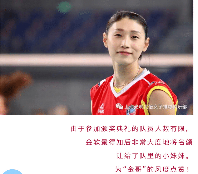 很快上海女排官方就揭晓了其中的原因,原来是由于排协参加颁奖典礼的队员人数有限,所以在得知球队是处于“超员”的这样,她非常大度地将名额让给了队里的小妹妹。上海女排也为金软景的行为点赞,这位韩国队队长确实非常大气。