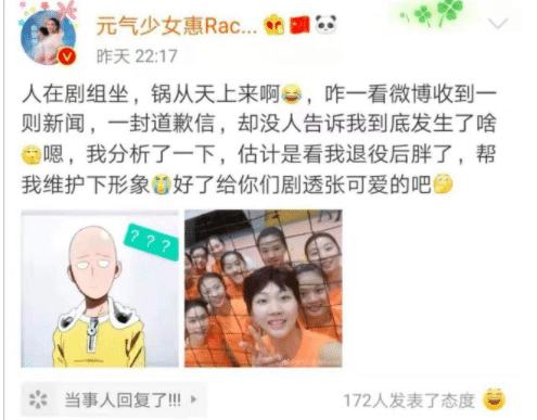 其实惠若琪也没有注意,但她的粉丝不干了,后期惠若琪在社交媒体上回应:“估计是看我退役后胖了,帮我维护下形象。”不追究责任,非常大气。
