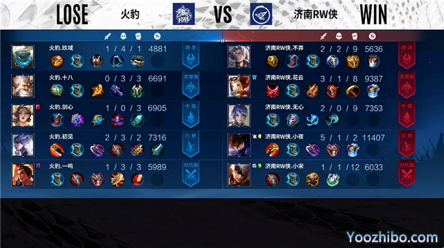 开局火豹三人抢线。56秒火豹发育路击杀鲁班大师拿到一血。3分02秒火豹主宰处击杀夏侯惇。4分13秒野区团战济南RW侠打出1换2。4分41秒济南RW侠摧毁敌方中路外塔。5分22秒济南RW侠野区打出0换2。7分22秒济南RW侠野区击杀吕布。7分53秒济南RW侠摧毁敌方中路二塔。9分30秒济南RW侠对抗路击杀盾山。10分01秒济南RW侠野区打出2换3。10分56秒济南RW侠拿下暗影主宰。11分29秒济南RW侠拿下暗影暴君。12分27秒高地团战济南RW侠打出0换4。12分44秒济南RW侠摧毁敌方水晶拿下比赛。