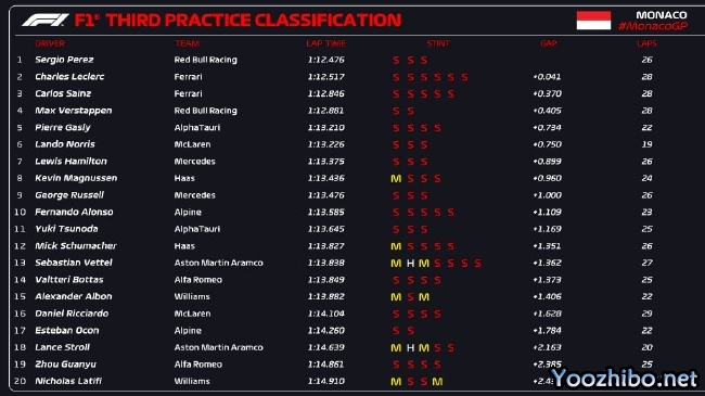 JRS直播网讯 北京时间5月27日,2022年F1摩纳哥大奖赛第3次练习赛在蒙特卡洛赛道结束,红牛车队佩雷兹最后时刻做出去1:12.476的成绩,取得三练第一,这也是本周末目前为止的最快单圈成绩;法拉利车队勒克莱尔落后0.041秒排名第二,另一位法拉利车手塞恩斯第三,落后0.370秒;维斯塔潘第四。