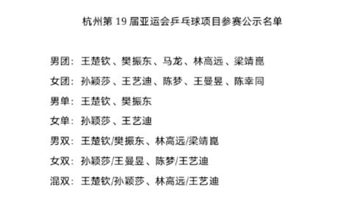 国乒亚运会名单出炉! 孙颖莎等身兼四项, 陈梦遗憾, 林高远入围