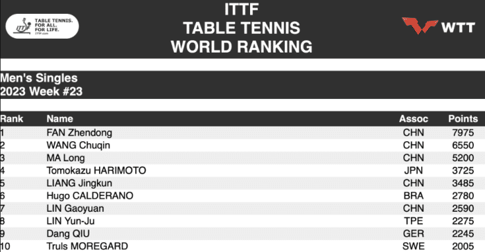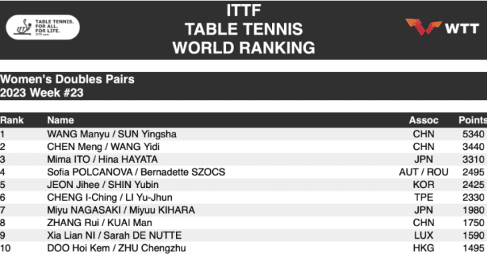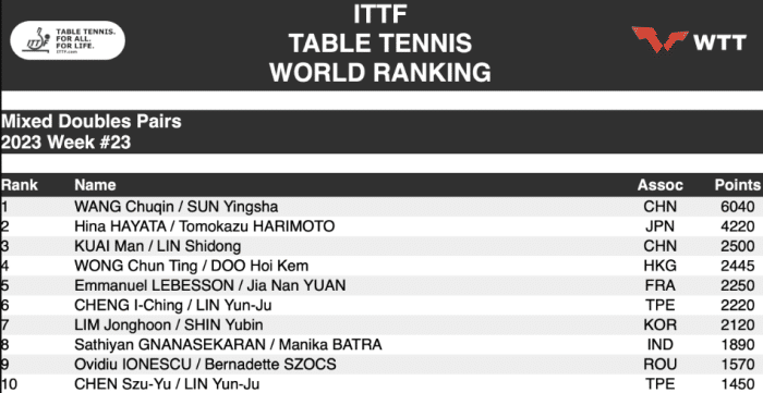 混双领域依旧是“莎头组合”王楚钦/孙颖莎第1,林诗栋和蒯曼位居第3。