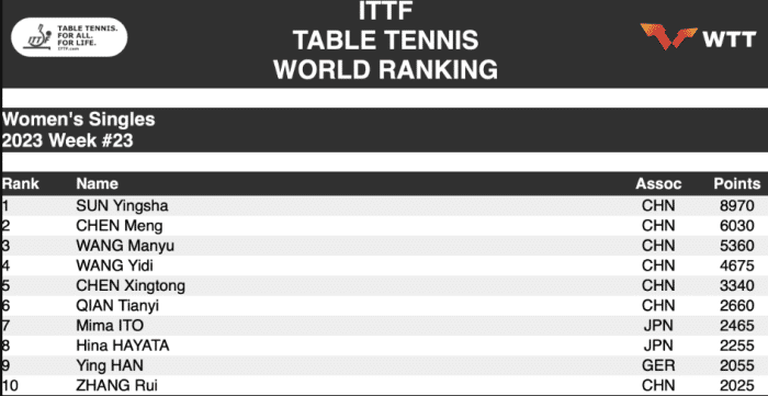 国际乒联最新排名:孙颖莎樊振东霸榜