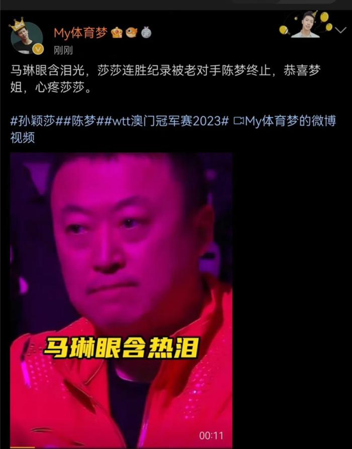 可是和在场边指挥,喜怒形于色一样,在场边观赛的马琳在看到陈梦击败了孙颖莎晋级后,马琳竟然激动的双眼含泪为陈梦感到开心,马琳的举动无疑是对于陈梦的偏爱,这也让很多孙颖莎的球迷很不爽的喊话马琳:“咋地,孙颖莎是外协的球员?陈梦赢了孙颖莎需要激动成这样吗?”
