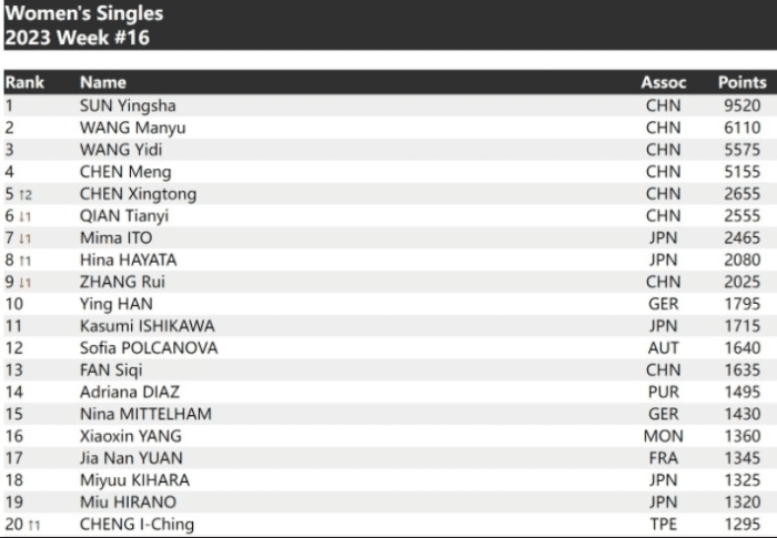 来源:JRS直播网04-18 10:32JRS直播网04月18日,国际乒联第16周排名更新,因为上周有积分很高的新乡冠军赛,所以排名有很大的变化。整体上来看,国乒世界排名无悬念领跑,5项第一,樊振东和孙颖莎依旧是最大赢家。女单的陈幸同反超伊藤美诚,升至前五。