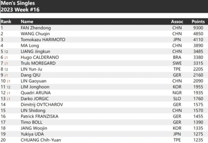 男单层面,樊振东以9300分排名第一,领先第二名的王楚钦接近一倍的分差。张本智和依旧排名第三,在新乡表现不佳的马龙排名第4,梁靖崑从上周的第7升至第5,他在新乡冠军赛打进决赛,获得亚军。近期没有比赛任务的林高远第10名。