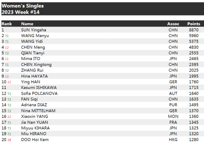 来源:JRS直播网04-04 10:23JRS直播网04月04日讯 国际乒联公布了2023年第14周的排名,因为此前奥运积分清零的原因,所以排名有很大的变化,比如男单的马龙从第二下滑到第四,王楚钦和张本智和的排名提升。女单的变化也非常大,王曼昱升至第二,王艺迪升至第三,钱天一升至第五,排名下滑的是陈梦,她从上一期的第二名来到本周之后排名跌至第四。
