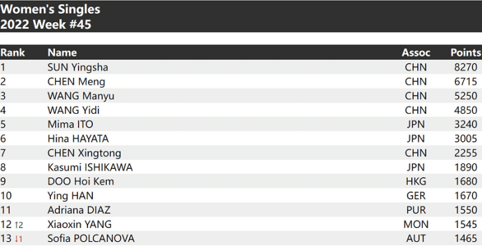 在女单层面,孙颖莎依旧是第一名,作为10月份三项大赛的冠军得主,孙颖莎以8270分,彻底甩开了和身后陈梦之间的差距,陈梦是6715分。王曼昱5350分,稳居女单的世界第1。王艺迪世界第4,日本名将伊藤美诚第5、早田希娜第6,陈幸同第7,石川佳纯第8,国乒和日本队的选手包揽了世界前8名。