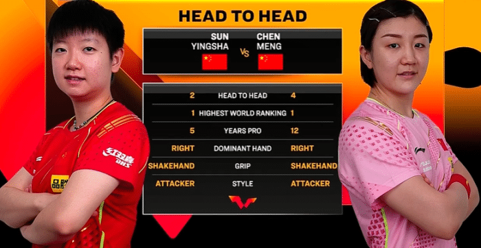 赛前:孙颖莎女单世界排名第一,陈梦第二。这是孙颖莎和陈梦在东京奥运会之后的首度在国际赛场交手,此前两人在国际赛场交手6次,陈梦4胜2负占据优势。