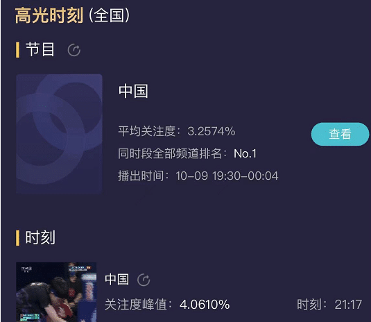这场国乒大战德国队的争冠之战关注度极高,收视率层面,平均收视率高达3.2574%,同时间段排名全国第一。巅峰时刻收视率更是破4%,高达4.0610%,可见大家对于这场冠军争夺战的关注。