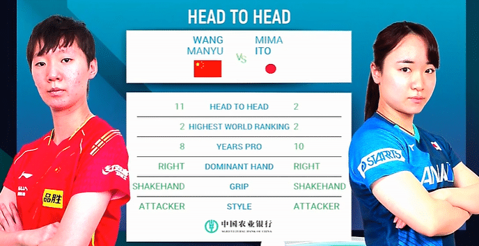 赛前:王曼昱位居世界第三,伊藤美诚位居世界第六。今年7月份,伊藤美诚和王曼昱在布达佩斯交手2次,全部输球。