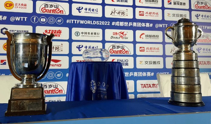 男团冠军和女团冠军的考比伦杯和斯韦斯林杯亮相抽签仪式现场。