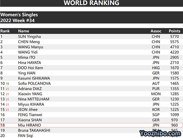 根据2022年8月22日国际乒联发布的最新的第34周女单排名中,平野美宇以960积分排名第18。