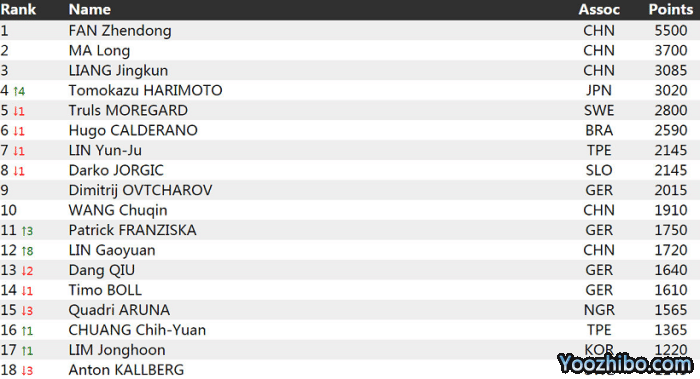 马龙第二梁靖崑第三名,其中马龙在奥运会结束之后整体的表现不是很好。当打之年的梁靖崑在国际赛场上并不具备统治力。张本智和依靠着WTT冠军赛布达佩斯站男单冠军,排名飙升了四名,直接来到世界第四,这位日本队的小将在决赛遇到林高远,上演了神奇的0-3落后,一度被对手拿到6个赛点的情况下大逆转好戏,以4-3击败林高远夺得冠军。林高远排名世界第12名。