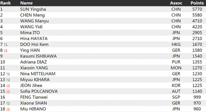 王曼昱依旧排名世界第三,带伤出战的她在WTT冠军赛布达佩斯站女单决赛,以4-2击败王楚钦,夺得冠军。在布达佩斯拿下1冠和1亚的王艺迪排名第四,她近期的表现和进步有目共睹。伊藤美诚排名第五,这位日本队乒乓球女单一姐,面对孙颖莎、王曼昱和王艺迪连续失败,表现确实不佳。