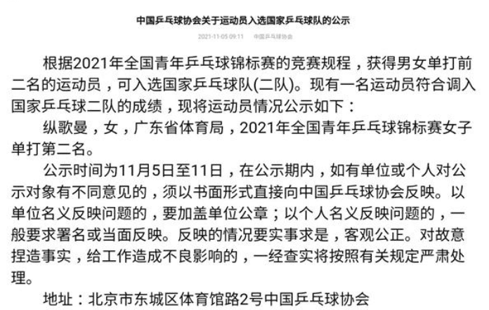来源:JRS直播网11-05 18:58JRS直播网讯 北京时间11月5日消息,来自中国乒协官网的消息,广东15岁女子小将纵歌曼将会上调到国家二队,从而成为国乒最年轻的运动员之一。纵歌曼此次入选国家队,也是因为此前在全国青年乒乓球锦标赛中获得亚军,可以说国乒这次又补充了后备力量。