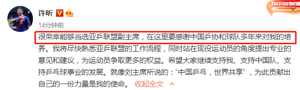 而就在今天深夜10点钟,许昕在社媒上发文谈到了当选亚乒联盟副主席的感想,他感谢了中国乒协和球队,还特意提到刘国梁指导,看看许昕是怎么说的吧。
