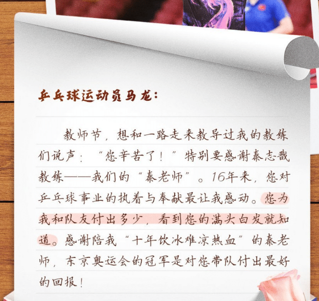 马龙写道:“特别要感谢秦志戬教练一一我们的‘秦老师’。16年来,您对乒乓球事业的执着与奉献最让我感动。您为我和队友付出多少,看到您的满头白发就知道。感谢陪我‘十年饮冰难凉热血’的秦老师,东京奥运会的冠军,是对您带队付出最好的回报!”