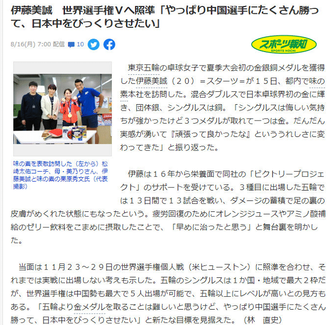 来源:JRS直播网08-16 16:03JRS直播网讯 伊藤美诚近期又放出豪言,根据《NHK》的报道显示,伊藤美诚在8月15日参加活动的时候,展望了在11月份进行的世乒赛,这位在奥运会上拿下1金1银1铜的乒乓球选手直言自己已经累计了很多的经验,将会击败中国队的选手,令全日本吃惊:“在世乒赛上希望能做更多事情,再次挑战中国选手,我希望在世乒赛上能击败很多中国选手,让全日本的观众都大吃一惊。”