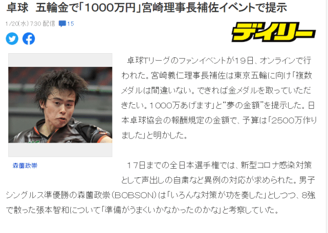 1000万日元!日乒为奥运金牌开出重奖,日网友嘲讽:空头支票