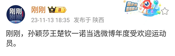 11月13日18时,拥有610万粉丝的大V“刚刚”也是率先发传出了喜报,“刚刚”在社交媒体上官宣:“刚刚,孙颖莎王楚钦一诺当选年度受欢迎运动员。”随后,王楚钦孙颖莎这边也是官宣了这个喜讯,众所皆知,某社交媒体发起的这个最受欢迎运动员的评选活动持续整整一年的时间,这也意味着想要最终脱颖而出就需要运动员有一年持续出色的表现,否则想要拿下这个奖项是非常的难,除了乒乓球之外,跳水的全红婵,游泳的张雨霏等等,这些都是高人气的存在。