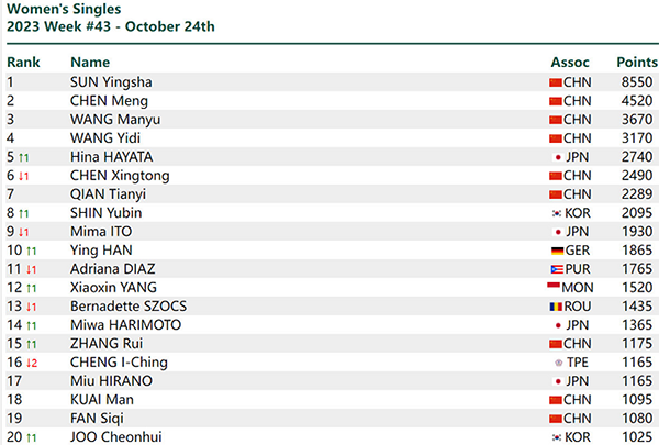 女单的变动也很大,前四依旧是孙颖莎、陈梦、王曼昱和王艺迪,其中孙颖莎的优势很大,属于断档式领跑。陈幸同的位置下降,她跌至第六,原因是早田希娜在欧洲连续夺冠,积分反超陈幸同,升至女单第五名。申裕斌超越伊藤美诚升至第八,日本名将伊藤美诚排名女单第九名。