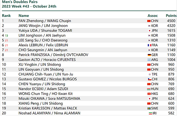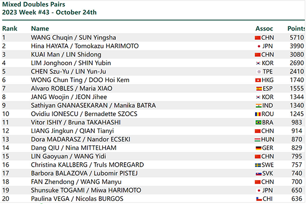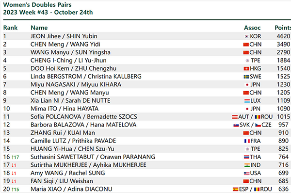 双打层面整体的变动不大,国乒依旧是在男双和混双处于领跑的位置,樊振东和王楚钦排名男双第一,王楚钦和孙颖莎排名混双第一。女双层面,杭州亚运会金牌得主申裕斌和田志希排名第一,这也是五个项目中,国乒唯一没有拿到第一的单项,陈梦和王艺迪第二,孙颖莎和王曼昱第三。