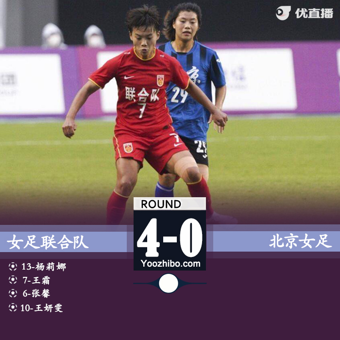 JRS直播网9月23日讯 北京时间9月23日16:00,全运会女足成年组半决赛,奥运联合队对阵北京队。上半场,张馨助攻杨莉娜头球建功,王霜随后角球制造对手乌龙;下半场,王霜助攻张馨破门锁定胜局,王妍雯中框后推射锦上添花。最终,奥运联合队4-0击败北京队进入全运会女足决赛,将与上海和陕西的胜者争夺金牌。
