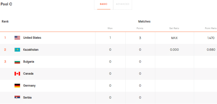C组实力最强的是美国队,首战她们以3-0横扫哈萨克斯坦,位居第一名。同一小组的还有塞尔维亚、加拿大这样的强队,塞尔维亚是卫冕冠军,4年前她们在决赛击败了拥有埃格努的意大利,夺得冠军。这个小组赛的竞争力十足,看点也很多。