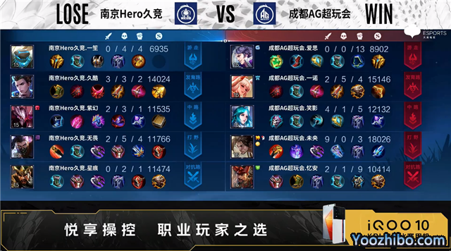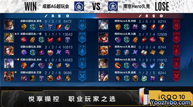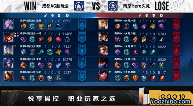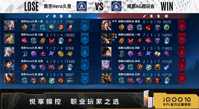 双方常规开局。1分58秒成都AG摧毁敌方对抗路外塔。2分59秒发育路双方1换1。3分23秒成都AG野区击杀项羽。3分56秒成都AG对抗路打出0换2。5分48秒南京Hero摧毁敌方发育路二塔。6分07秒主宰处团战南京Hero打出0换2。6分31秒南京Hero拿下暴君。7分50秒野区团战成都AG打出1换2。9分48秒中路下河道双方1换1。10分38秒成都AG拿下暗影暴君。11分35秒成都AG中路打出0换2。12分27秒野区团战南京Hero击杀牛魔,成都AG拿下暗影主宰。13分45秒成都AG发育路击杀宫本武藏。14分02秒成都AG摧毁敌方中路高地塔。14分29秒成都AG拿下暗影暴君。15分45秒成都AG摧毁敌方对抗路高地塔。16分10秒南京Hero中路击杀不知火舞。16分27秒南京Hero拿下暗影主宰。16分57秒野区团战成都AG打出1换3。17分28秒成都AG摧毁敌方水晶拿下比赛。