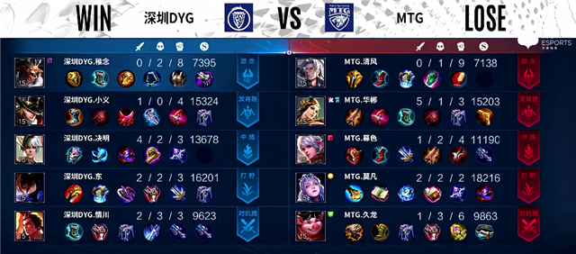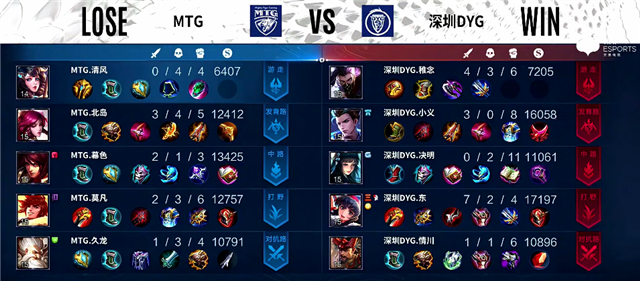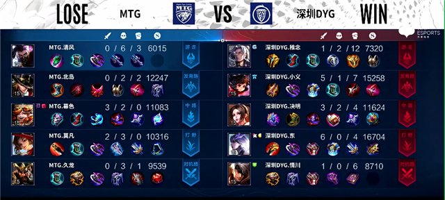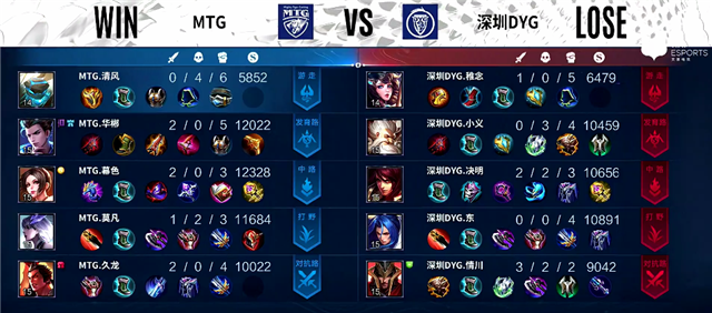 开局MTG入侵蓝区拿下蓝Buff。2分40秒MTG再次入侵野区,娜可露露拿下一血。3分钟娜可露露拿下主宰。4分40秒裴擒虎拿下暴君。5分40秒深圳DYG强攻下路一塔,伽罗被击杀,老夫子推掉上路一塔。6分钟中路团战,大乔被击杀。6分20秒野区团战,双方2换2。7分40秒下路团战,MTG打出0换2。7分50秒双方互换边路二塔。8分钟中路团战,双方1换1。9分37秒裴擒虎拿下暴君。10分29秒娜可露露拿下暴君,裴擒虎拿下主宰。14分20秒中路团战,双方1换1,深圳DYG推掉中路一塔。15分钟暴君团,深圳DYG打出1换2。15分20秒娜可露露拿下暴君。16分18秒娜可露露拿下主宰。17分钟周瑜推掉中路一塔。19分30秒上路团战,深圳DYG打出1换4。20分12秒深圳DYG推掉水晶再拿一分。