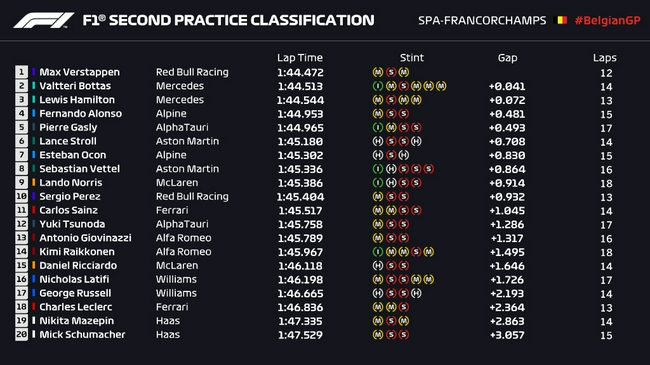 2021年F1比利时大奖赛第2次练习赛成绩表: