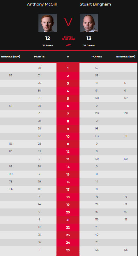 首局双方就打到最后时刻,麦克吉尔清台以58-56先拔头筹。第2局麦克吉尔再赢一局,单杆59分以71-58翻盘2-0领先。第3局宾汉姆终于把握住机会,一杆得到60分以71-26获胜。第4局宾汉姆在0-50落后的情况下,一杆64分后来居上,追至2-2来到中场休息。