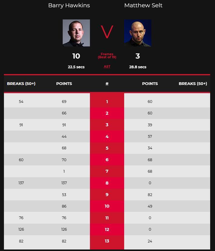 第5局,霍金斯再次依靠多次上手,以68-34胜出。第6局,霍金斯轰出单杆60分,以70-68险胜将大比分扩大为5-1。第7局,塞尔特难得发挥不错,凭借多次上手,以68-1再扳一局。第8局,霍金斯状态爆发,直接轰出单杆137分,以137-0一杆制胜。第9局,两人都没能打出单杆50+,比赛也进行得相当胶着。最终,塞尔特以82-53又追一局,大比分3-6落后结束第一阶段比赛。