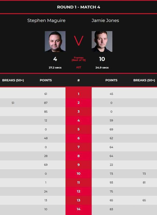 在前三局,两人手感都算不上好,打得磨磨蹭蹭,且仅仅出现了一杆50+,马奎尔连赢三局、3-0领先。第4局,琼斯59-12拿下,追回了一局。而在休息之后,从第5局到第8局,琼斯全部拿下,5-3反超,且有两局完成了零封,马奎尔则是失误不断,连续送出好机会。第9局马奎尔69-22艰难挽回颜面,但第一阶段过后仍然4-5落后。