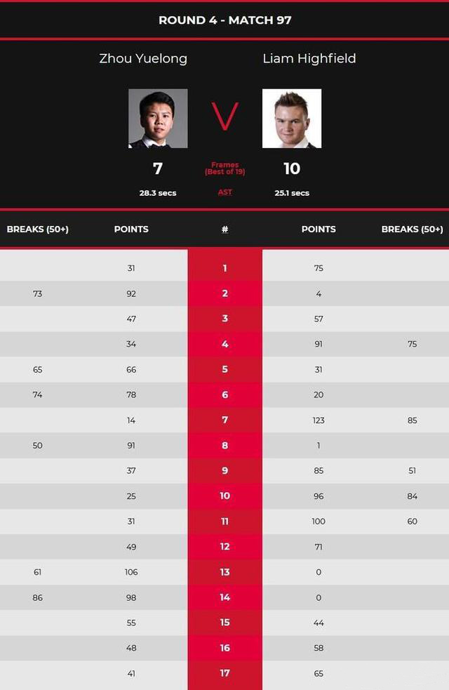 首局,海菲尔德通过多次上手,以75-31先胜一局。第2局,周跃龙凭借单杆73分,以92-4回敬一局。第3局,双方再次陷入胶着,海菲尔德以57-47险胜。第4局,海菲尔德轰出单杆75分,以91-34再胜,大比分3-1进入局间休息。