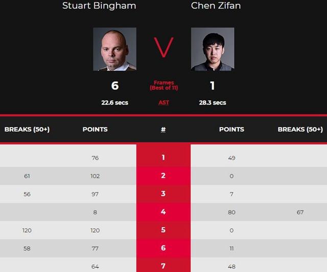第5局,陈子凡打丢长台,宾汉姆迅速入局,单杆120分再次零封,4-1。第6局,宾汉姆单杆58分、77-11再下一城,5-1带出赛点。第7局,陈子凡在清台时追到了42-59,但打丢了关键蓝色球,宾汉姆上手扩大优势超分,顺利拿下,6-1大胜晋级。