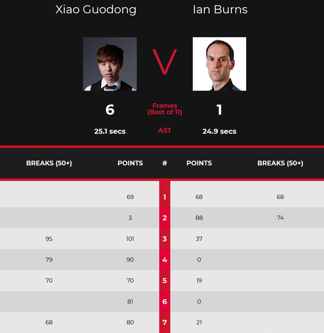 第7局,伯恩斯上手21分后失误并且漏下机会,肖国栋单杆68分、80-21轻松赢下,6-1大胜晋级。