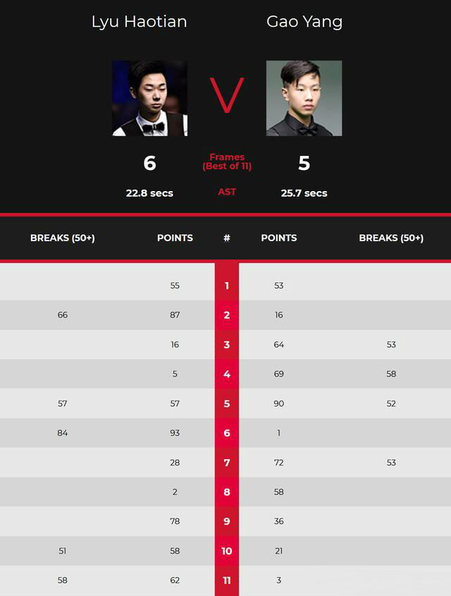 第1局,两人就打得难解难分,55-53,吕昊天2分险胜。第2局,吕昊天延续手感,单杆66分、87-16再下一城。不过之后高阳突然发力,连续打出了三杆50+,连赢三局,3-2反超吕昊天。第6局,吕昊天当纳84分止住颓势,3-3打平。