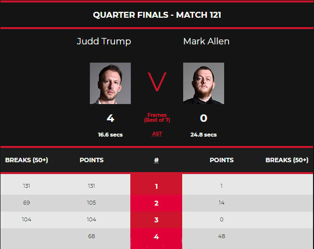 第三局,特鲁姆普长台直接上手,单杆104分拿下。第四局,艾伦单杆12分,红球不进;特鲁姆普手架红球不进,艾伦机会球不进,特鲁姆普同样简单球不进;艾伦单杆5分防守;艾伦留下机会,特鲁姆普单杆30分,红球失误;艾伦单杆21分防守;艾伦拼红球进攻,母球摔袋;特鲁姆普单杆单杆34分拿下比赛。